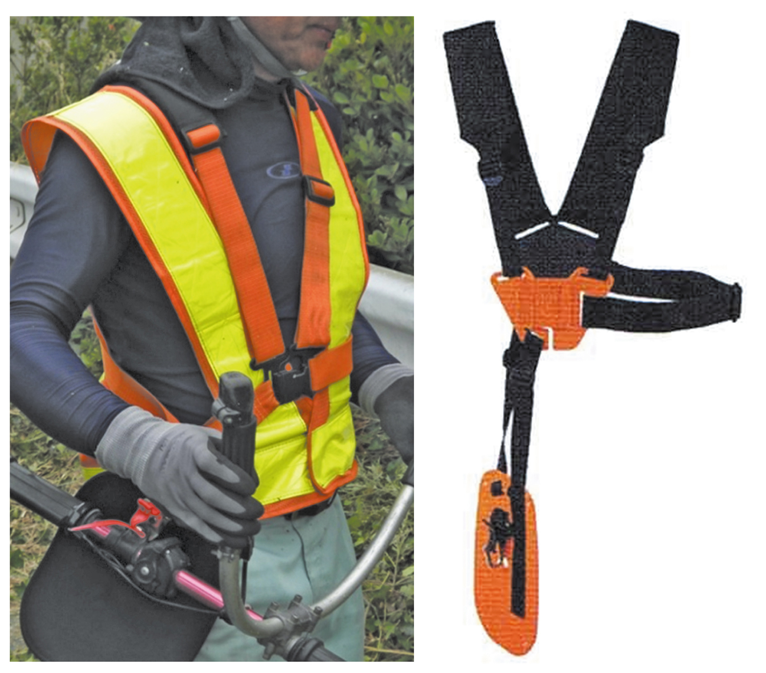 草刈り機にはクロス式肩掛けベルトを装着する。