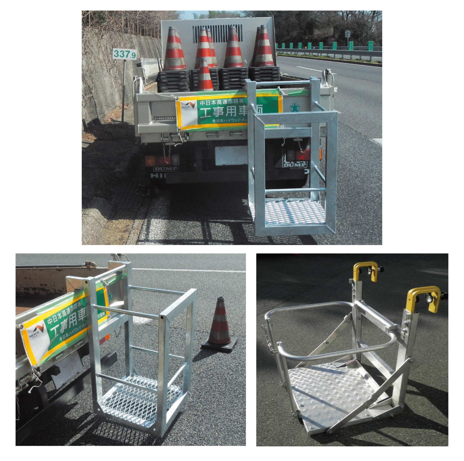 作業車の後あおり部に取り付け、作業員が乗り込みラバーコーンの設置又は撤去を行う。