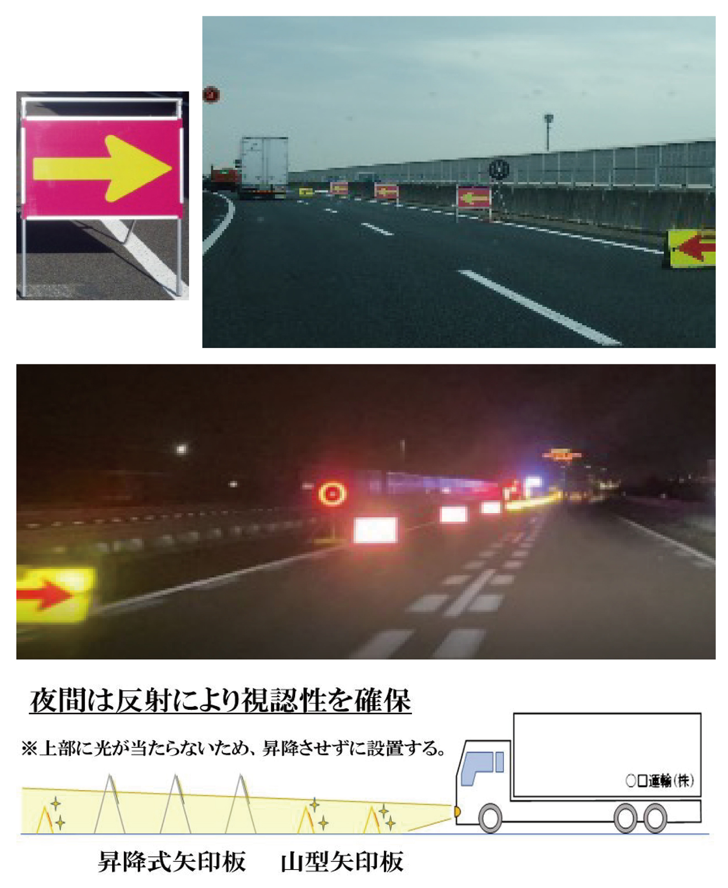 矢印板は超高輝度広角プリズム反射型(DG3)を使用。通常の矢印板に比べて輝度をグレードアップさせている。 昼間規制の場合は昇降させて設置、夜間規制の場合は昇降させずに設置する。(業研発表資料より)