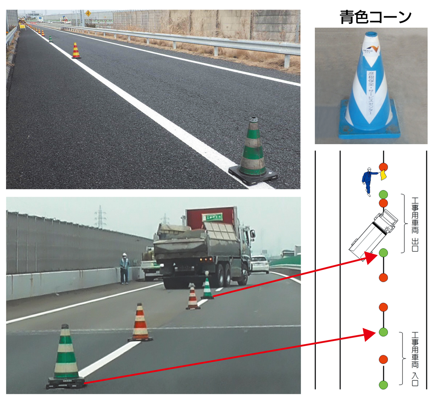 工事用車両が出入りする箇所には緑色又は青色コーンを設置する。