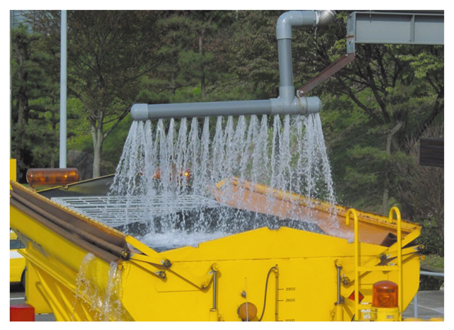 車両上部での作業を避けるため、溶液積込用ホースをシャワー装置と付け替える。