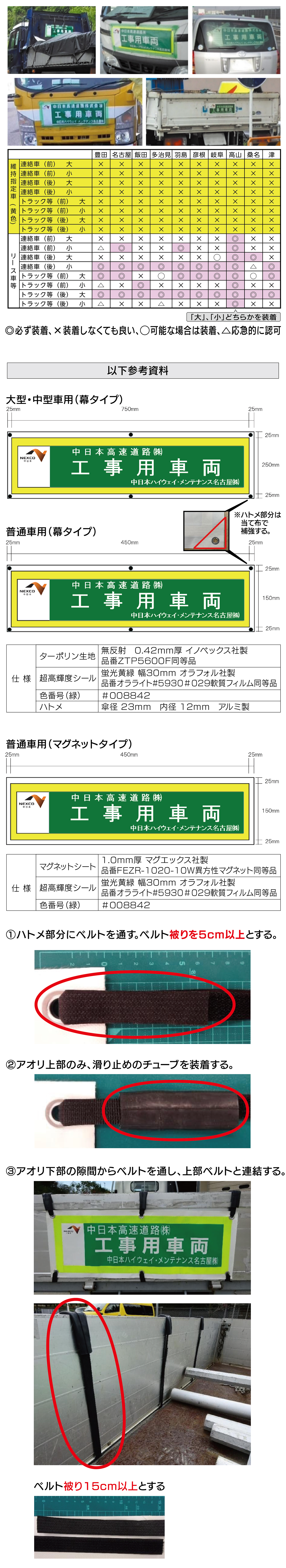高所作業車、ヒアブ車などで『大』の設置が困難な場合は『小』を装着することがある。 豊田事業所では、大型車については大を前後に設置、中型以下の工事用車両においては後方のみ設置することもある。また、車両形状にあわせ工事用車両幕を設置する。