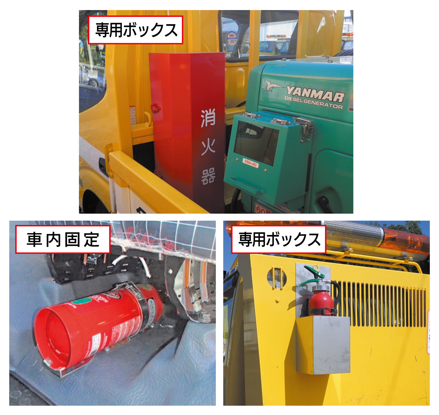 消火器を車載する場合は、車内に固定、又は荷台の専用ボックス等に収納する。