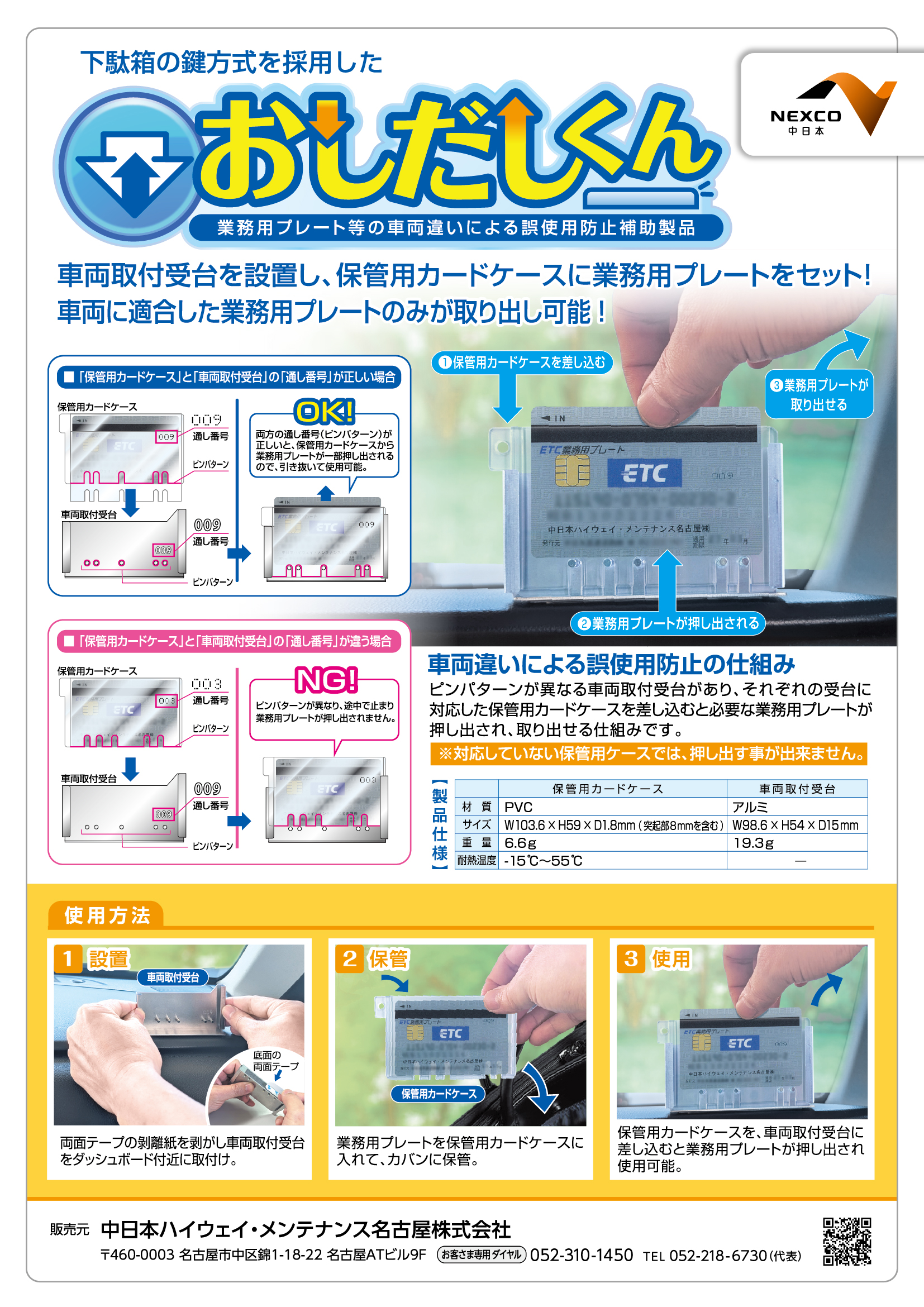 車両に取り付けた受台に対応したピンパターンを持つ保管用カードケースを差し込むと、必要な業務用プレートが押し出され取り出せる仕組み。
