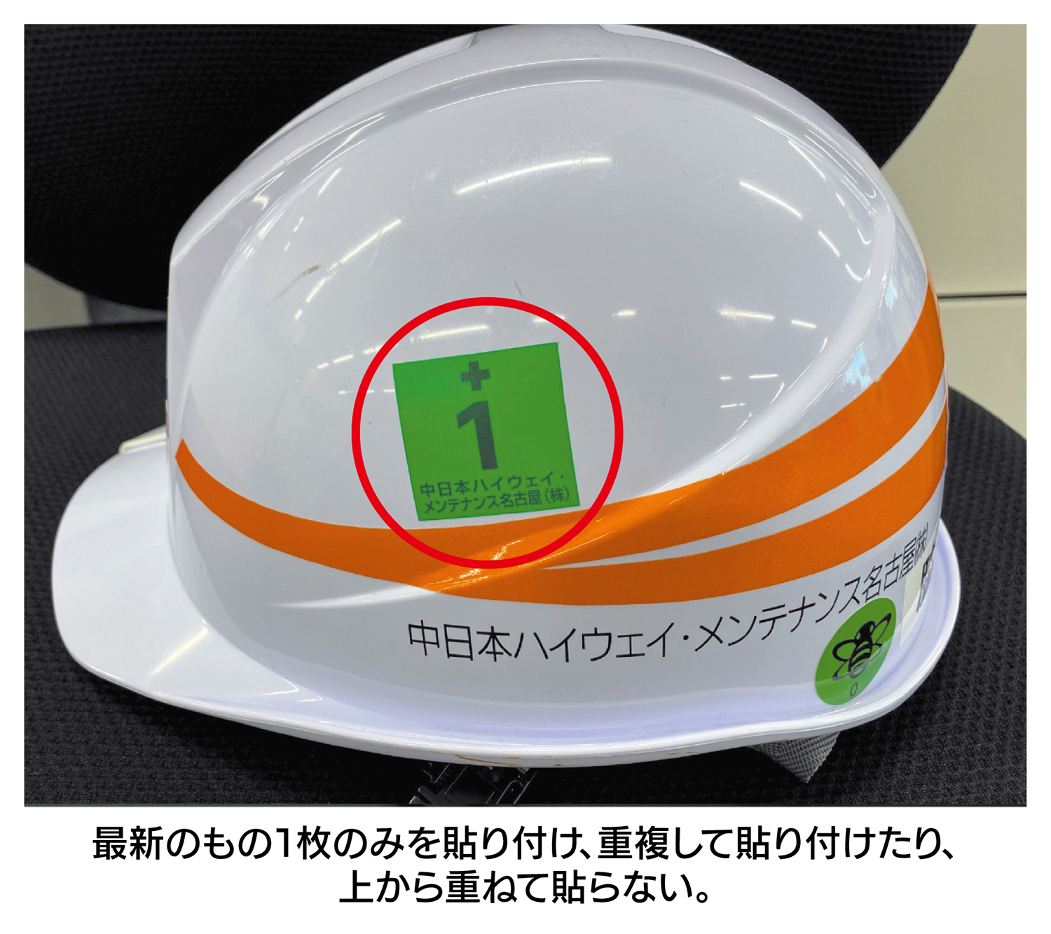 安全大会に参加した者はヘルメットに月別ミーティングシールを貼る。