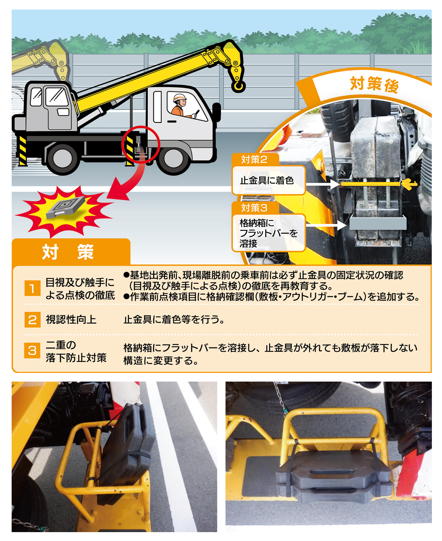 敷板を格納する場所については2重の落下防止対策を行うこと。